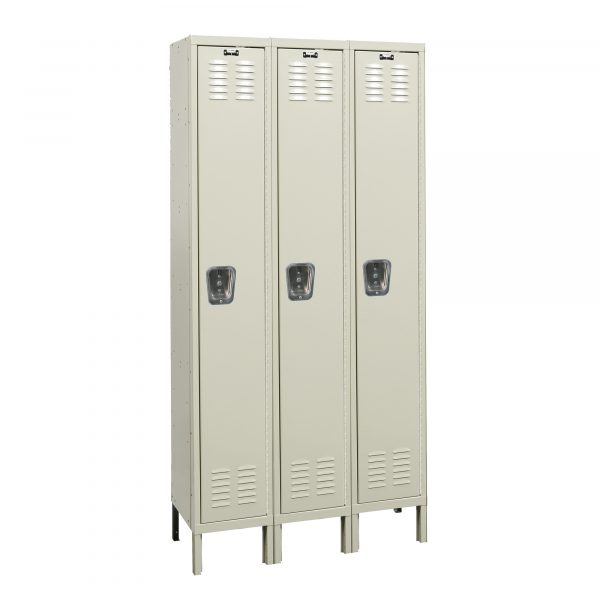 Our corrosion resistant lockers offer the strength benefits of steel lockers while providing protection in moist environments. Sheet steel components are fabricated of a specially treated steel called galvanneal. Galvanneal is steel that is hot dipped to provide a zinc coating and is then heat treated (annealed) to provide a hardened barrier that allows for a high quality powder coat finish. Our multi-point gravity lift-type latching for wardrobe lockers assures a secure locker while box lockers offer a simple thru-the-door finger pull single-point latch. All doors are louvered for ventilation and include a continuous piano hinge to insure a smooth door operation. Wardrobe doors include a stainless steel recessed handle allowing the lock to sit fully-recessed into the door for added safety while reducing vandalism and improving overall locker appearance. Wardrobe lockers allow for larger personal storage while box lockers are perfect for storing of smaller personal items. Galvanite corrosion resistant steel lockers are perfect in damp, humid or moist areas. Locks are not included. Order 3-wide units for best value and order 1-wide units where needed to complete your layout. Lockers are available to ship fully-assembled or knock-down. Color is Parchment.