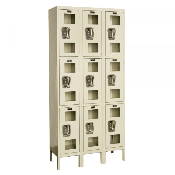 Visibility, these lockers are all about visibility. See what you are missing, see what your employees are storing in your facility, see what your students are storing in your school, see what your employees are hiding. Our Safety-View and Safety-View Plus lockers allow a clear view into the locker so you can monitor locker contents while offering a secure personal storage space. Polycarbonate door panels and all polycarbonate doors provide steel-like strength. Safety-View wardrobe doors are fabricated of heavy-gauge steel with clear door inserts while box lockers include all polycarbonate injection molded doors. Doors include a continuous piano hinge to insure a smooth door operation. Don’t be fooled by plexiglas imitations.our Safety-View polycarbonate is designed to hold up to years of heavy-duty use. Our multi-point gravity lift-type latching for wardrobe lockers assures a secure locker while box lockers offer a simple thru-the-door finger pull single-point latch. All doors are louvered for ventilation. Wardrobe doors include a stainless steel recessed handle allowing the lock to sit fully-recessed into the door for added safety while reducing vandalism and improving overall locker appearance. Wardrobe lockers allow for larger personal storage while box lockers are perfect for storing of smaller personal items. Locks are not included. Order 3-wide units for best value and order 1-wide units where needed to complete your layout. Lockers are available to ship fully-assembled or knock-down. Color is Parchment.