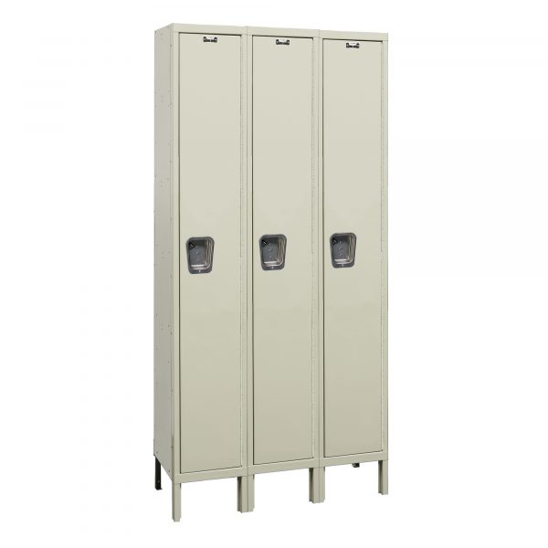 These single-point latch lockers offer maximum door strength by incorporating a welded-in full-height door stiffener providing a torque-free door. A continuous piano hinge insures worry-free door operation. The no moving parts latching mechanism reduces life-cycle costs. The stainless steel recessed handle allows the lock to sit fully-recessed into the door for added safety while reducing vandalism and improving overall locker appearance. Wardrobe lockers allow for larger personal storage while box lockers are perfect for storing of smaller personal items. Locks are not included. Order 3-wide units for best value and order 1-wide units where needed to complete your layout. Lockers are available to ship fully-assembled or knock-down. Choose from tow popular colors: Parchment or Hallowell Gray.