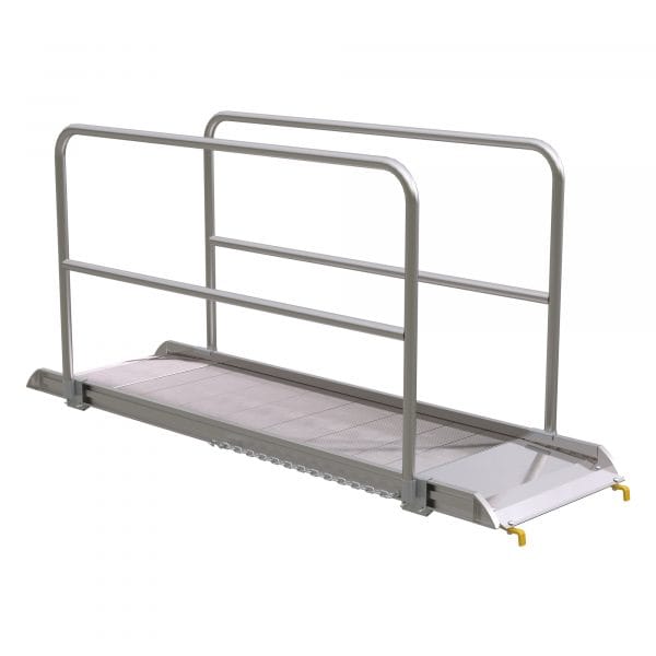 The Aluminum Walk Ramp with hand rails enables delivery men/women, shippers, and receivers to load and unload trucks when docks are unavailable. Heavy-duty steel chains with steel grab hooks are attaches to each side of ramp for safely securing ramp to truck. Constructed of strong aluminum alloy with non-skid tread surface. The ramp is lightweight and easy to handle. This steel hook style mounts onto the truck extensions.