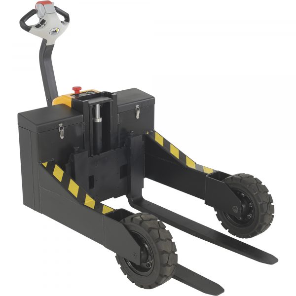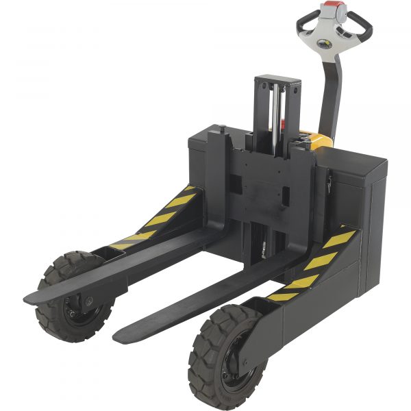 The Vestil All-Terrain Narrow Pallet Truck with 24V DC Battery Pack is the perfect outfit for moving heavy loads over a variety of landscapes. The simple functionality of the unit allows the user to maneuver the truck easily, both loaded and loaded. The driving handle is centrally located, and other functions are placed just underneath the handle on the front console. Forks are adjustable to best fit the users’ needs.