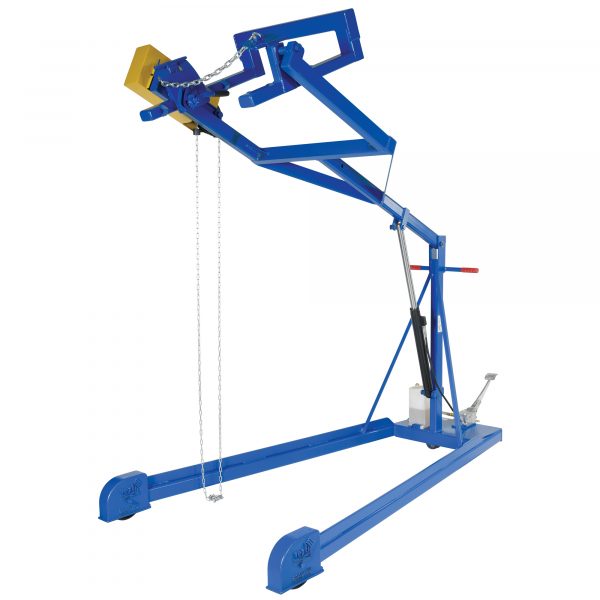 The Hydraulic drum stacker is perfect for positioning steel drums horizontally on shelves. The solid steel construction provides stability during transit. Drums are held in place with a ratchet mechanism. Fully loaded drums rotate. Pull chain drum rotation. Unit rolls easily on casters. Comes standard with hydraulic foot pump.