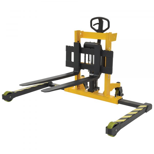 Manual Hydraulic Hand Pump Stackers are sturdy and compact to fit through standard height doors. Forks are raised by manual hydraulic hand pump operation and released by a lever situated on the handle. 1in. lift per handle pump. Two rigid and two swivel wheels standard.