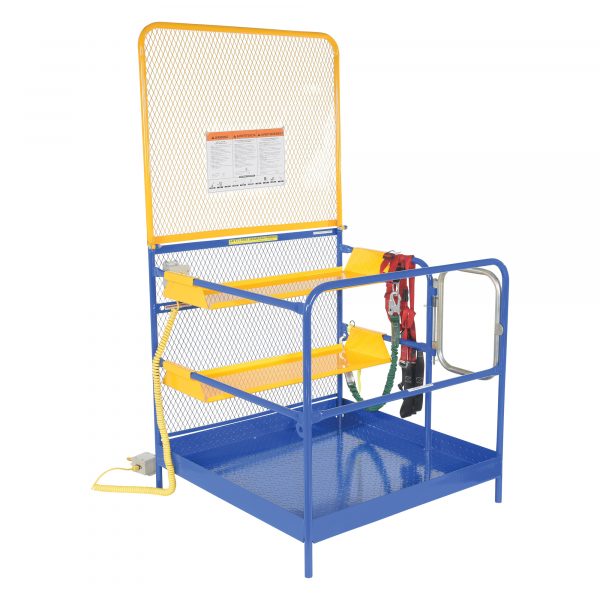 This convenient fork truck work platform quickly and safely raises maintenance personnel where they are needed. Attaches to fork truck by inserting forks into fork pockets and securing platform to fork truck. Fork locks secure platform to forks. Dual handrails on three (3) Sides. Expanded metal backing on fourth side. Includes checker floor plate platform and long strap with hook to attach platform to fork truck. A maximum of two (2) People can be in the work platform at one time. Meets California OSHA specifications.